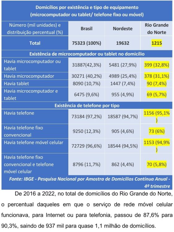Estima-se uma contínua expansão da posse de telefone celular no período abrangido pela pesquisa, variando de 76% da população de 10 anos ou mais de idade, em 2016, para 80%, em 2021, até atingir 81,9%, em 2022. A parcela que tinha acesso à Internet por meio desse aparelho aumentou de 75,3% em 2016 para 96,2%, em 2022. Já entre os estudantes que tinham telefone móvel celular para uso pessoal no Rio Grande do Norte (481 mil pessoas), a parcela que tinha acesso à Internet nesse aparelho era de 98,9%