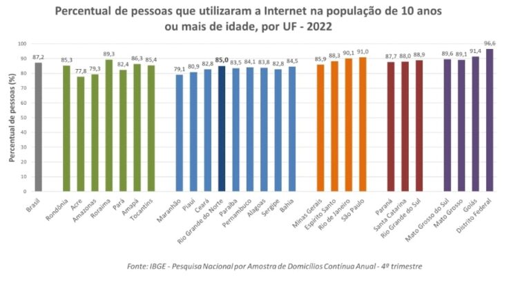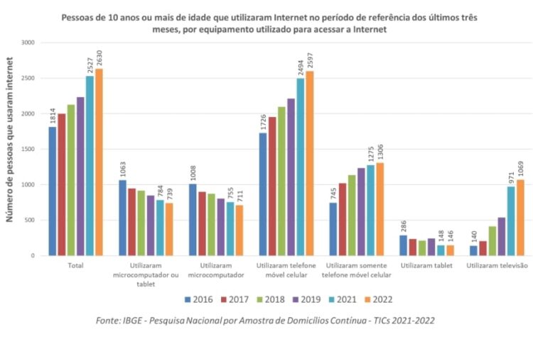 Entre as pessoas de 10 anos ou mais de idade que utilizaram Internet no período de referência, 93,2% usavam de forma habitual todos os dias; 3,3% utilizavam quase todos os dias (cinco ou seis dias por semana); 2,8% de uma a quatro vezes por semana; e apenas 0,6% utilizavam com uma frequência inferior a uma vez por semana. O meio de acesso indicado pelo maior número de pessoas foi o telefone móvel celular (98,8%), seguido, em menor medida, pela televisão (40,7%), pelo microcomputador (27%) e pelo tablet (5,5%). De 2016 a 2022, houve um aumento do uso do celular e da televisão para acessar a Internet e uma redução do uso do microcomputador e do tablet.
