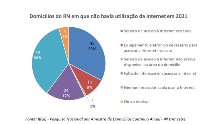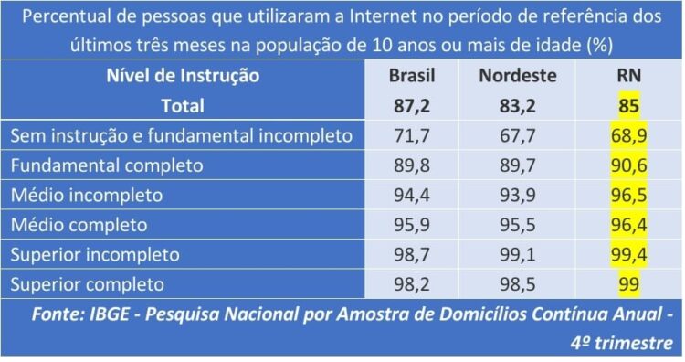 A Internet era utilizada em 90,1% dos domicílios particulares permanentes (1,1 milhão) do estado e 105 mil deles possuíam algum tipo de dispositivo inteligente (câmeras, caixas de som, lâmpadas, ar-condicionado, geladeiras etc.). O percentual dos que usavam banda larga móvel passou de 62,9% para 71,2% entre 2021 e 2022. Ao passo que o percentual dos domicílios que utilizavam a banda larga fixa aumentou de 91,2% para 91,8% nesse mesmo período. O rendimento médio mensal real per capita nos domicílios potiguares em que havia utilização da Internet (R$ 1275) foi quase 70% acima do rendimento nos que não utilizavam essa rede (R$ 864).
