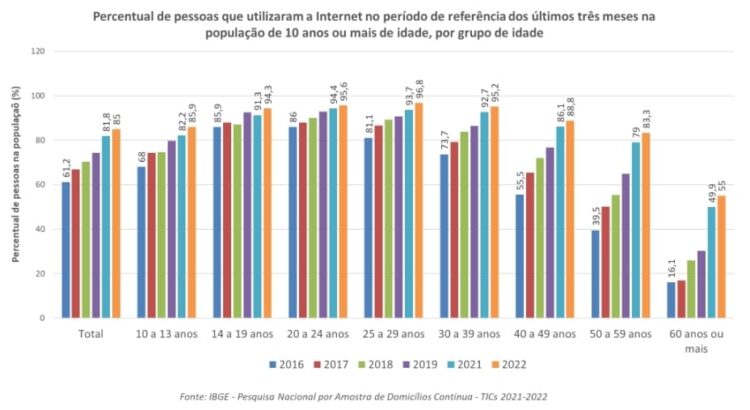 Por grupos de idade, o percentual mais baixo de pessoas que utilizaram a Internet, no período de referência dos últimos três meses, foi grupo etário acima de 60 anos (55%), seguido do grupo de 50 a 59 anos (83,3%). Já os maiores percentuais foram no grupo etário de 25 a 29 anos (96,8%) e no de 20 a 24 anos (95,6%). O aumento do percentual de pessoas que utilizaram a Internet, entre 2016 e 2022, foi maior nos grupos etários de 50 a 59 anos e de 60 anos ou mais de idade (aumento de 43,8 p.p. e 38,9 p.p., respectivamente). Em relação a 2021, esses grupos também apresentaram as maiores expansões no percentual de usuários da Internet (4,3 p.p. e 5,1 p.p., respectivamente).