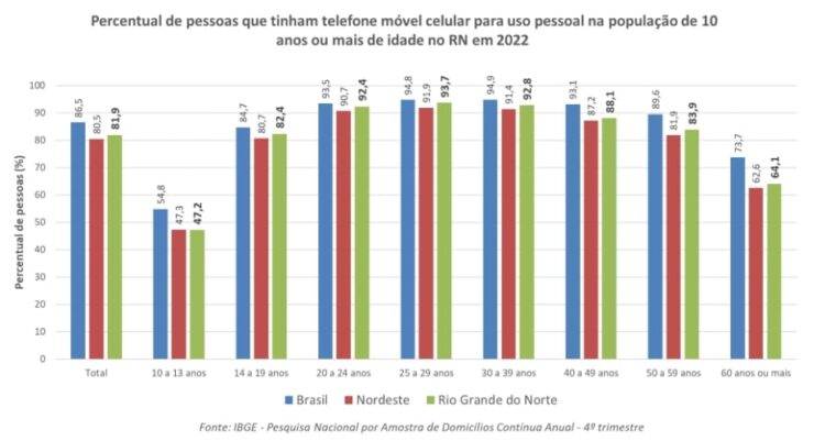 2,5 milhões de pessoas têm celular no Rio Grande do Norte: maioria são adultos jovens de 25 a 39 anos