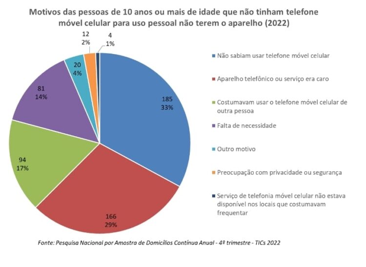 Em 2022, no RN, estima-se que 561 mil pessoas não tinham telefone móvel celular para uso pessoal, representando 18,1% da população de 10 anos ou mais de idade do estado. Esse percentual era 23,3%, em 2019, e 20%, em 2021. Dentre os motivos alegados para não se ter o aparelho, os três que mais se destacaram agregaram, em conjunto, quase 80% das pessoas de 10 anos ou mais de idade que não tinham esse aparelho, no estado. No contingente dos que não tinham telefone móvel celular para uso pessoal, 33% alegaram que não sabiam usar telefone móvel celular; 29,5%, que o aparelho telefônico era caro; e 16,7%, costumava usar o telefone móvel celular de outra pessoa.