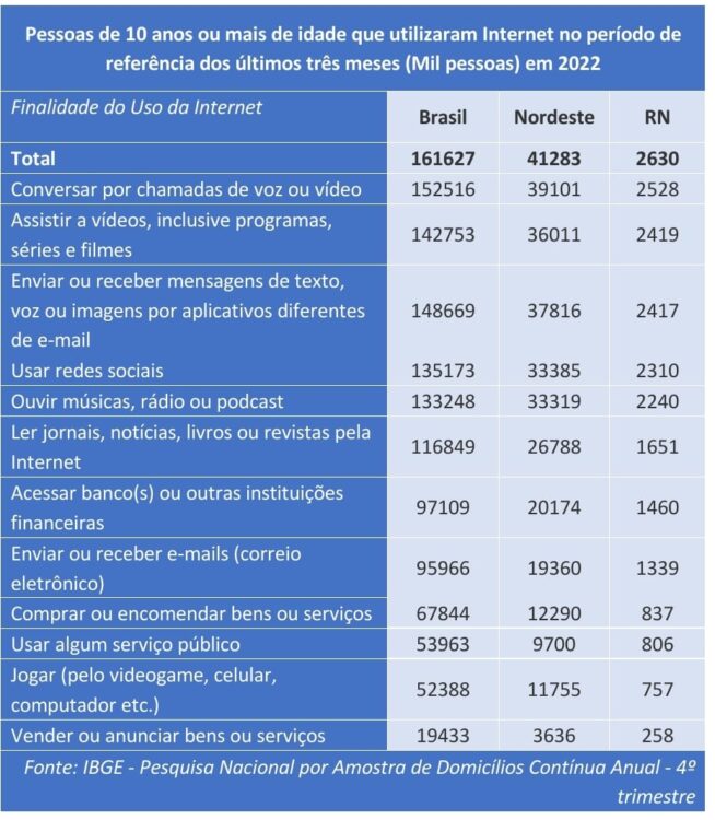 Das 2,6 milhões de pessoas no estado que usaram a internet, a maioria tinha como finalidade conversar por chamadas de voz ou vídeo (96,1%), assistir a vídeos, inclusive programas, séries e filmes (92%) ou enviar ou receber mensagens de texto, voz ou imagens por aplicativos diferentes de e-mail (91,9%). Usar redes sociais (87,8%), ouvir músicas, rádio ou podcast (85,2%); ler jornais, notícias, livros ou revistas pela Internet (62,8%); acessar banco(s) ou outras instituições financeiras (55,5%); e enviar ou receber e-mails (50,9%) foram as outras finalidades mais citadas. Os dados são da Pesquisa Nacional por Amostra de Domicílio Contínua 2022, módulo de acesso à internet e à televisão e posse de telefone móvel celular para uso pessoal.