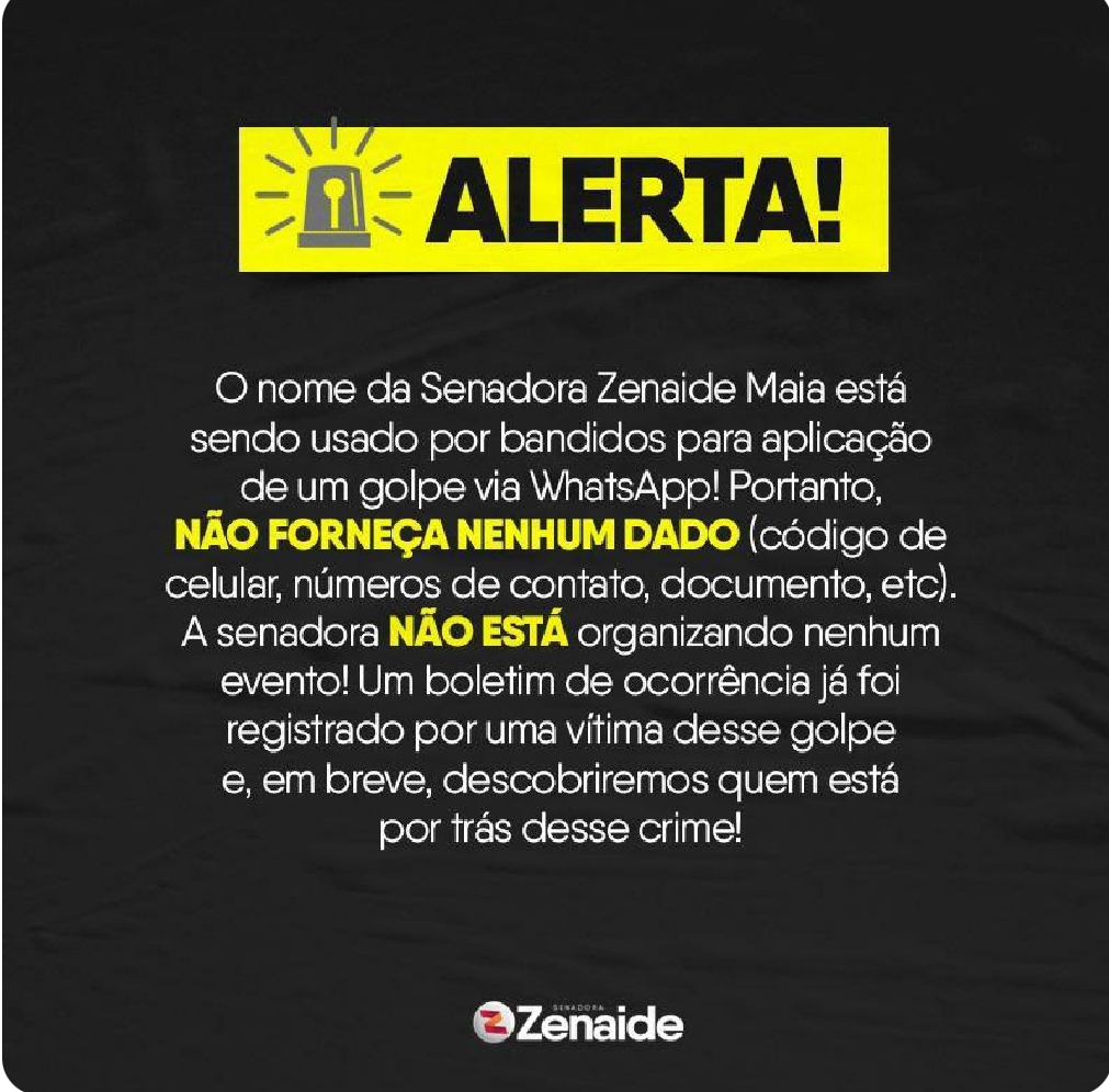 A Senadora Zenaide Maia (PROS) anunciou nas redes sociais que o nome dela está sendo usado em um golpe na Internet usando o Whatsapp. A parlamentar recomendou que ao público que não forneça nenhum dado e reforçou que não está organizando qualquer evento.