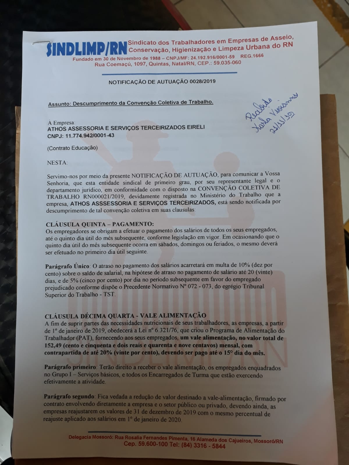 O Sindicato dos Trabalhadores em Empresas de Asseio, Conservação, Higienização e Limpeza Urbana do Rio Grande do Norte (Sindlimp/RN) notificou a empresa Athos pelos atrasos nos pagamentos salariais.