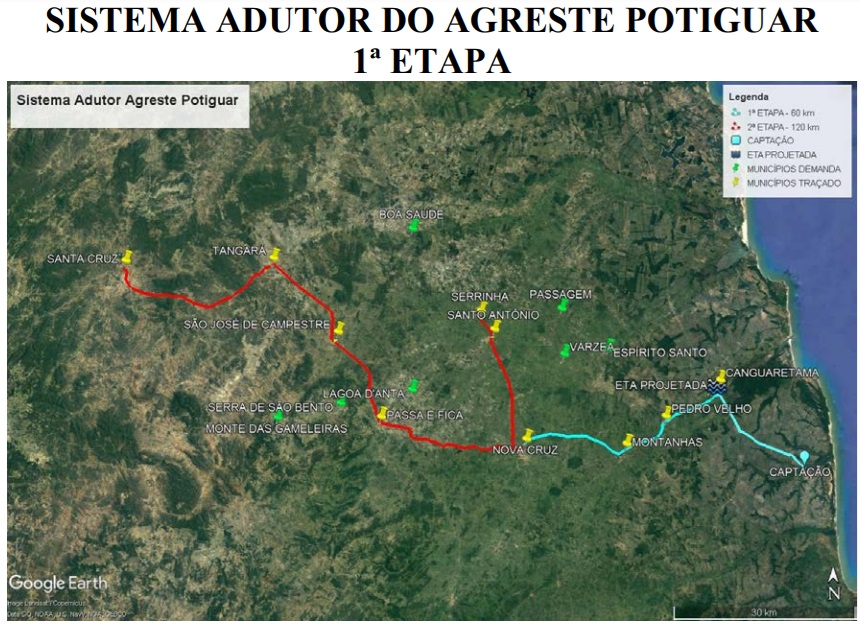 O Sistema Adutor Agreste Potiguar compreende duas etapas. A primeira etapa (já inclusa no Novo Programa de Aceleração do Crescimento – Novo PAC do Governo Federal) terá extensão de 59Km e atenderá os municípios de Canguaretama, Pedro Velho, Montanhas e Nova Cruz.