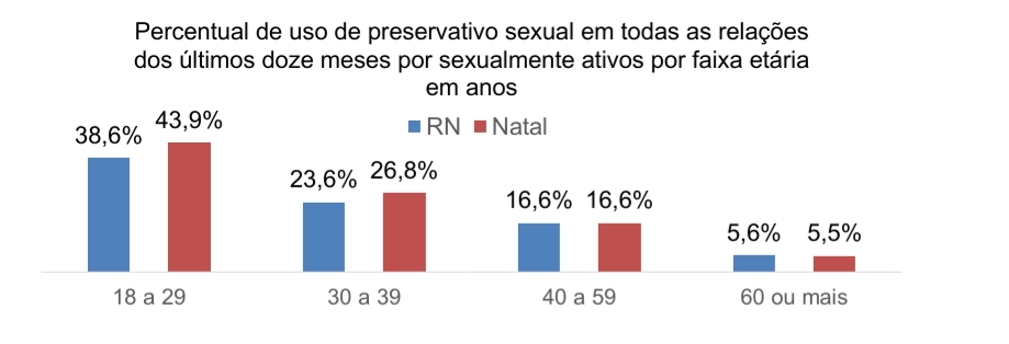 No estado, o uso regular de preservativos em todas as relações sexuais nos 12 meses anteriores à pesquisa foi de 23,1% da população sexualmente ativa. Essa proporção equivale a 426 mil potiguares. Em Natal, o índice foi de 25,7%, correspondendo a 130 mil natalenses.