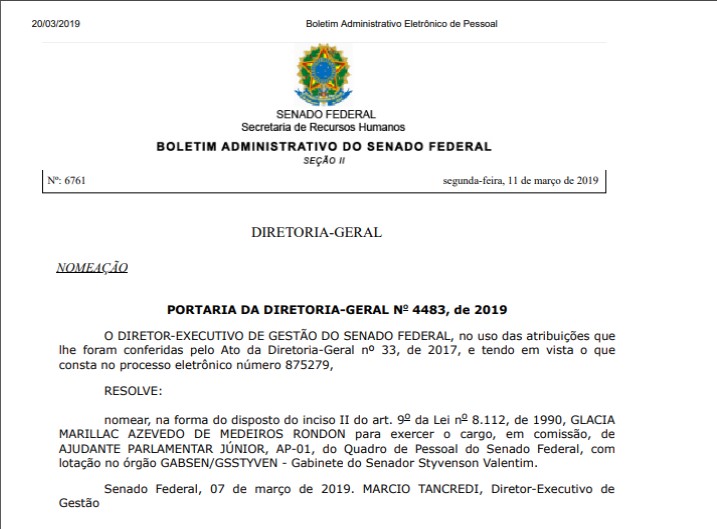 O senador Styvenson Valetim (PODE) envia ao Blog do Barreto a informação de que a primeira nomeação com base na seleção de servidores para o gabinete aconteceu no dia 7 de março.