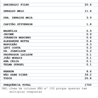 No comparativo com a última pesquisa, o capitão subiu de 27,29% para 33% (+ 5,71%) e a deputada federal de 17,29% (+9,06%) para 26,35%. Já Garibaldi Alves Filho subiu de 20,94% para 25,05% (+4,11%) e Geraldo de 14,42% para 19,71% (+ 5,29%).