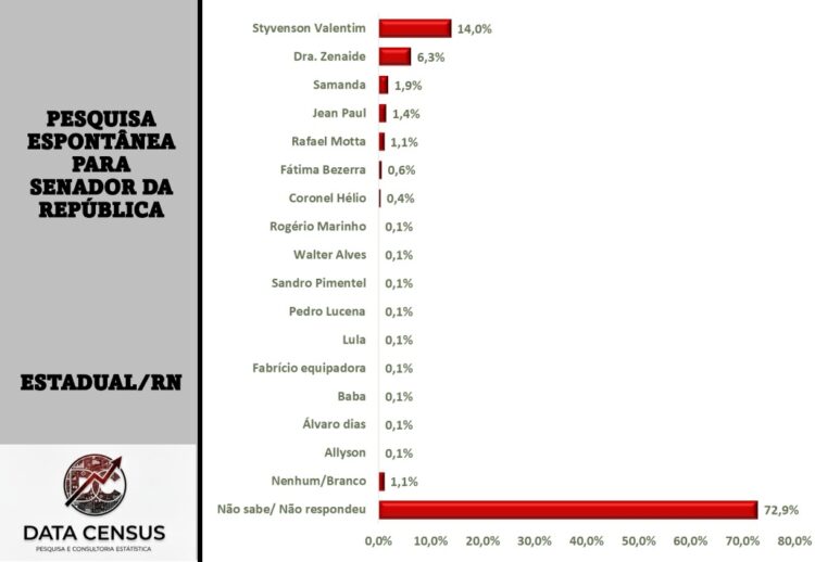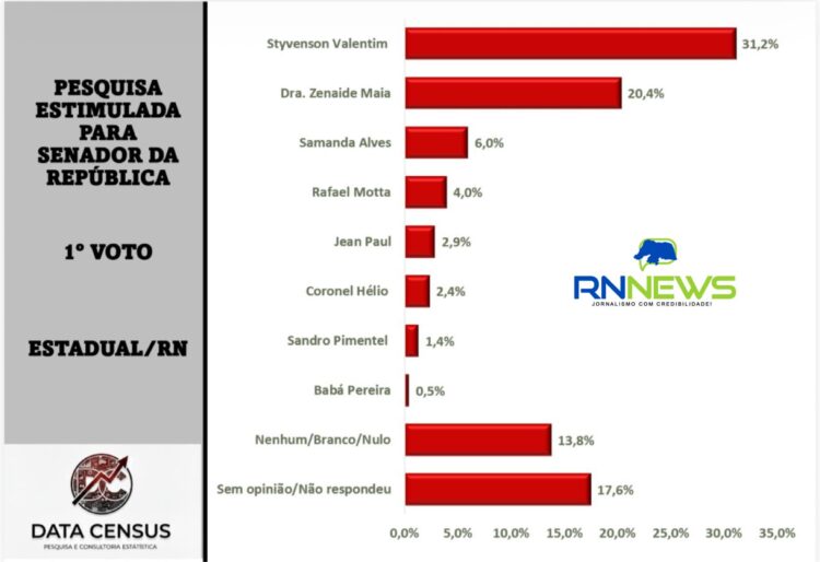 A pesquisa realizada pelo Instituto Data Census, divulgada em parceria com o portal RN News, liderança dos atuais senadores Styvenson Valentim (Podemos) e a senadora Zenaide Maia (PSD).