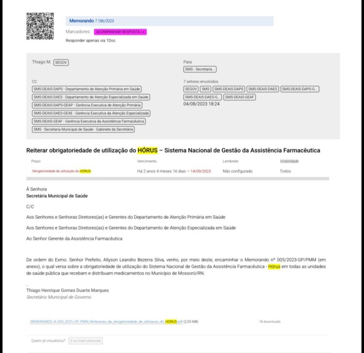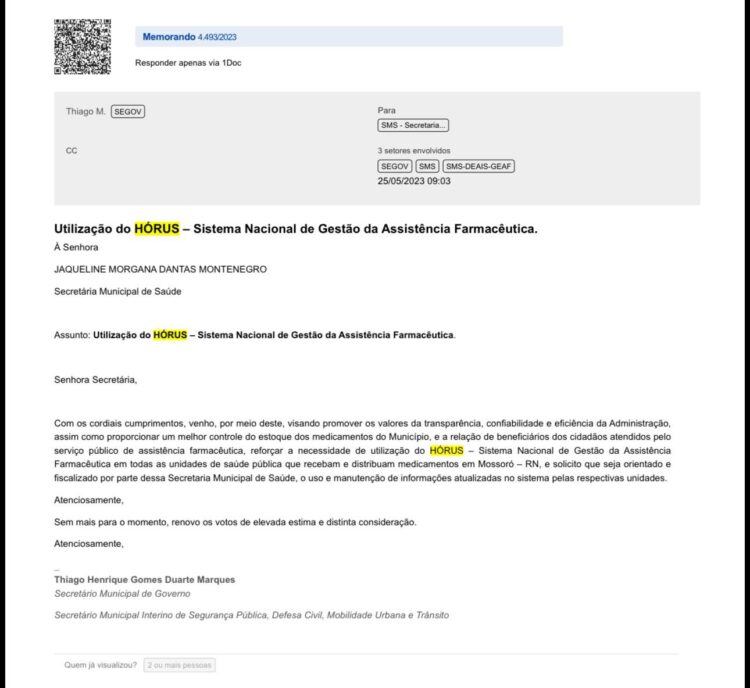 O Blog do Barreto solicitou a comunicação do município que enviou os comprovantes de que o então secretário de governo Thiago Marques (atualmente vereador) oficiou a secretária de saúde Morgana Dantas para aderir ao Sistema Hórus, do Ministério da Saúde, para monitorar o estoque de medicamentos.