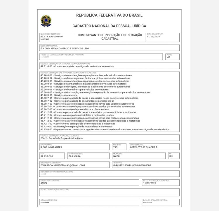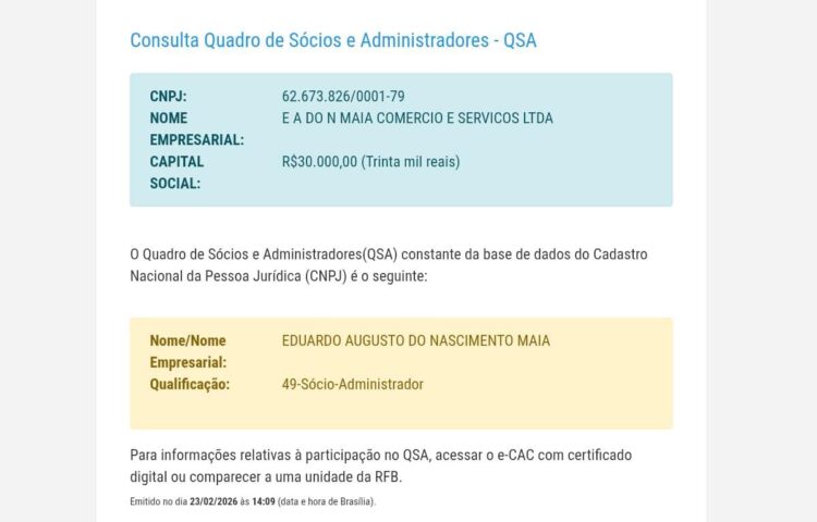 A empresa possui CNPJ nº 62.673.826/0001-79 e, conforme consulta pública ao Quadro de Sócios e Administradores (QSA), tem como sócio-administrador Eduardo Augusto do Nascimento Maia. Portaria da Câmara Municipal registra o nome como ocupante de cargo comissionado no gabinete do vereador Aldo Clemente, anunciado publicamente como líder do prefeito na Câmara. A decisão do TCE limita-se a registrar o dado funcional extraído de sistemas oficiais, sem antecipar conclusão sobre eventual irregularidade.