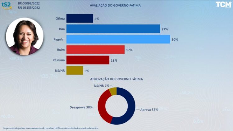 Segundo os dados aferidos, 55% dos entrevistados aprovam o governo de Fátima, 38% desaprovam e 7% não souberam ou não quiseram responder.
