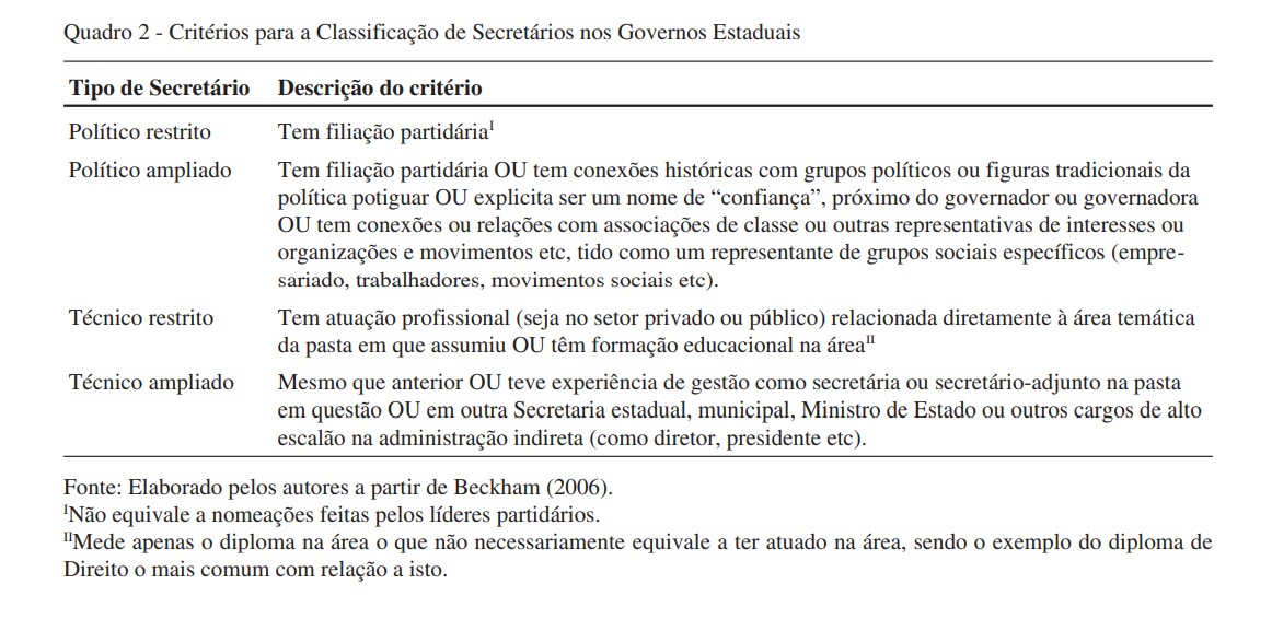 O estudo mostra que em democracias parlamentaristas são os partidos que pinçam de seus quadros os indicados para compor os governos. Eles também comparam a situação no RN com estudos como o de Sandes-Freitas & Massoneto (2017) que apontam peso partidário nas nomeações no Piauí e São Paulo. Ele também cita o trabalho de Passos (2013) sobre o Rio Grande do Sul que indicou o PDT ocupando 85% das secretarias na gestão de Alceu Colares (1991/95) comparada com a de Antonio Britto (1994/98) que fez um governo todo montado a partir de indicações partidárias.
