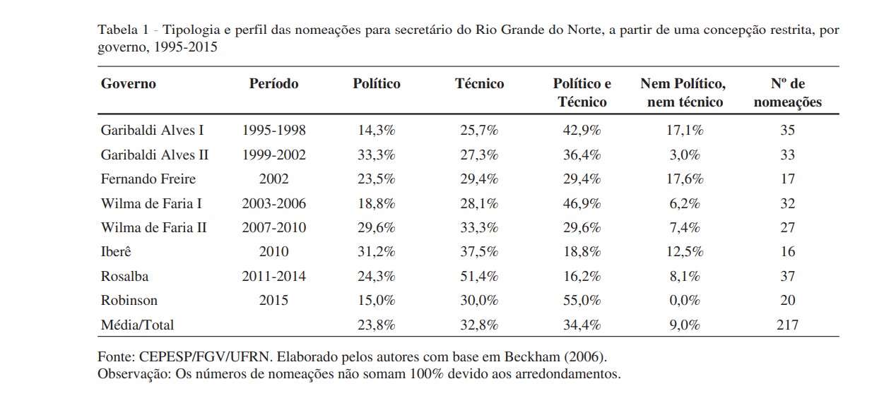 Um estudo realizado pelos professores Sandra Gomes, Alan Daniel Freire de Lacerda e André Luís Nogueira da Silva traçou o perfil do secretariado potiguar entre os anos de 1995 e 2015, um trabalho que visou identificar se existiu no período que abrangeu seis gestões (quatro eleitas – Garibaldi Alves Filho, Wilma de Faria, Rosalba Ciarlini e Robinson Faria- e dois mandatos “tampões”- Fernando Freire e Iberê Ferreira) houve predominância técnica ou política, além da influência dos acordos forjados na Assembleia Legislativa.