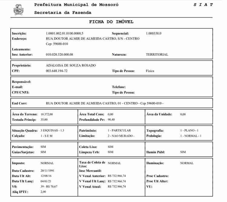 Os anos de 2014 e 2015 também estão prescritos. Já 2016 prescreveu em julho deste ano, porém, a Secretaria de Tributação negativou a proprietária do Sítio Canto em fevereiro passado. A negativação é quando o nome do proprietário do imóvel vai para o Serviço de Proteção ao Crédito (SPC). Por fim, o mais grave: no período de 2017 a 2020, quando Rosalba Ciarlini Rosado estava prefeita de Mossoró, o IPTU do Sítio Cantópolis igualmente não foi pago. Esse período foi todo negativado pela secretaria mencionada acima.