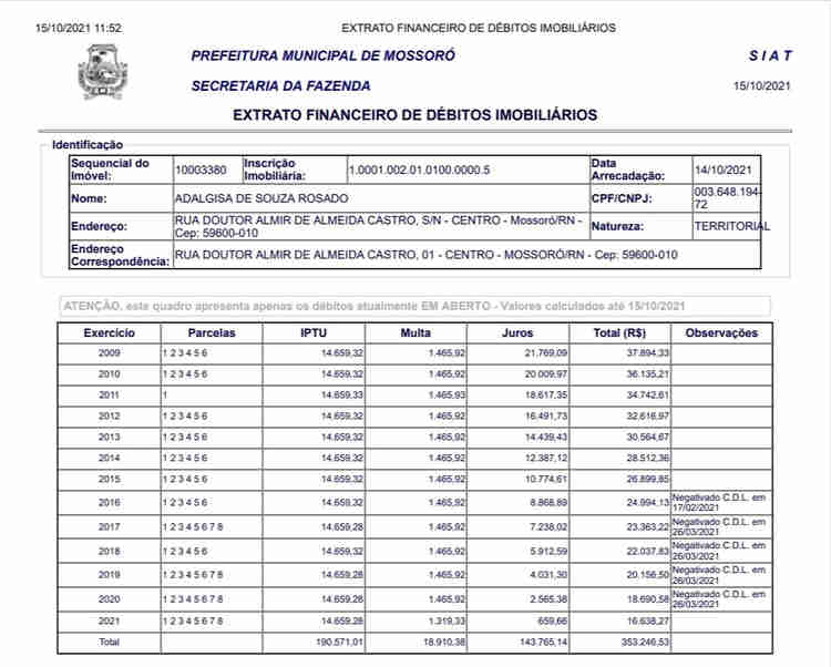 Idêntico aos anos anteriores, em 2021 o imposto não foi pago – apesar da ampla campanha de incentivo e conscientização realizada pela Prefeitura de Mossoró -, o que coloca o renomado casal de políticos entre os inadimplentes com o imposto este ano, ou seja, no grupo das pessoas que, muitas vezes por falta de dinheiro ou desemprego, não consegue pagar seus impostos. A dívida atual referente ao Sítio do Canto, devidamente calculada, está em R$ 353.246,53.