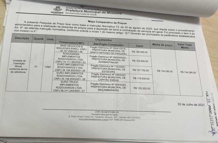 Uma tomada de preços realizada pela Prefeitura de Mossoró em julho do ano passado para saber onde sairia mais barato comprar o Castramóvel com R$ 145 mil da emenda da deputada estadual Isolda Dantas (PT) apontou uma média de preço de 134.290,00.
