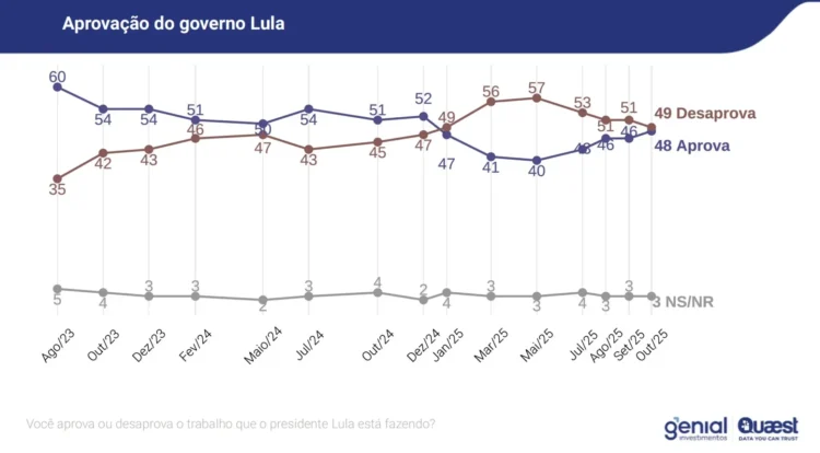 Esta é a primeira vez, desde janeiro, que há empate entre os dois indicadores. No início do ano, 49% desaprovavam Lula, já a aprovação era de 47%. A diferença de um ponto é a menor desde dezembro de 2024, quando a aprovação era maior que a desaprovação (52% a 47%).