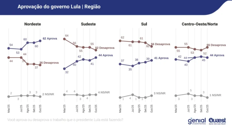 Por região, Lula mostrou uma recuperação da aprovação no Nordeste, passando de 53% para 62 % e no Sul, de 35% para 41%. No Sudeste, a popularidade do governo oscilou positivamente desde o anúncio do tarifaço (de 40% para 44%).