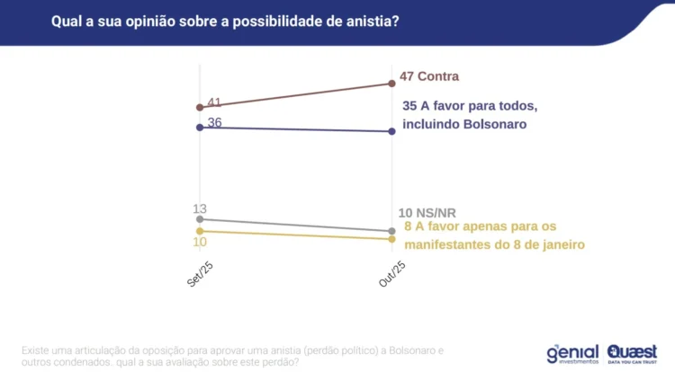 De acordo com a pesquisa, aumentou o percentual de brasileiros contrários a qualquer tipo de anistia aos golpistas (saiu de 41% para 47%). Sobre o PL da Dosimetria, 52% acreditam que que as penas aplicadas até aqui são justas contra 37% que defendem que as penas foram duras demais.