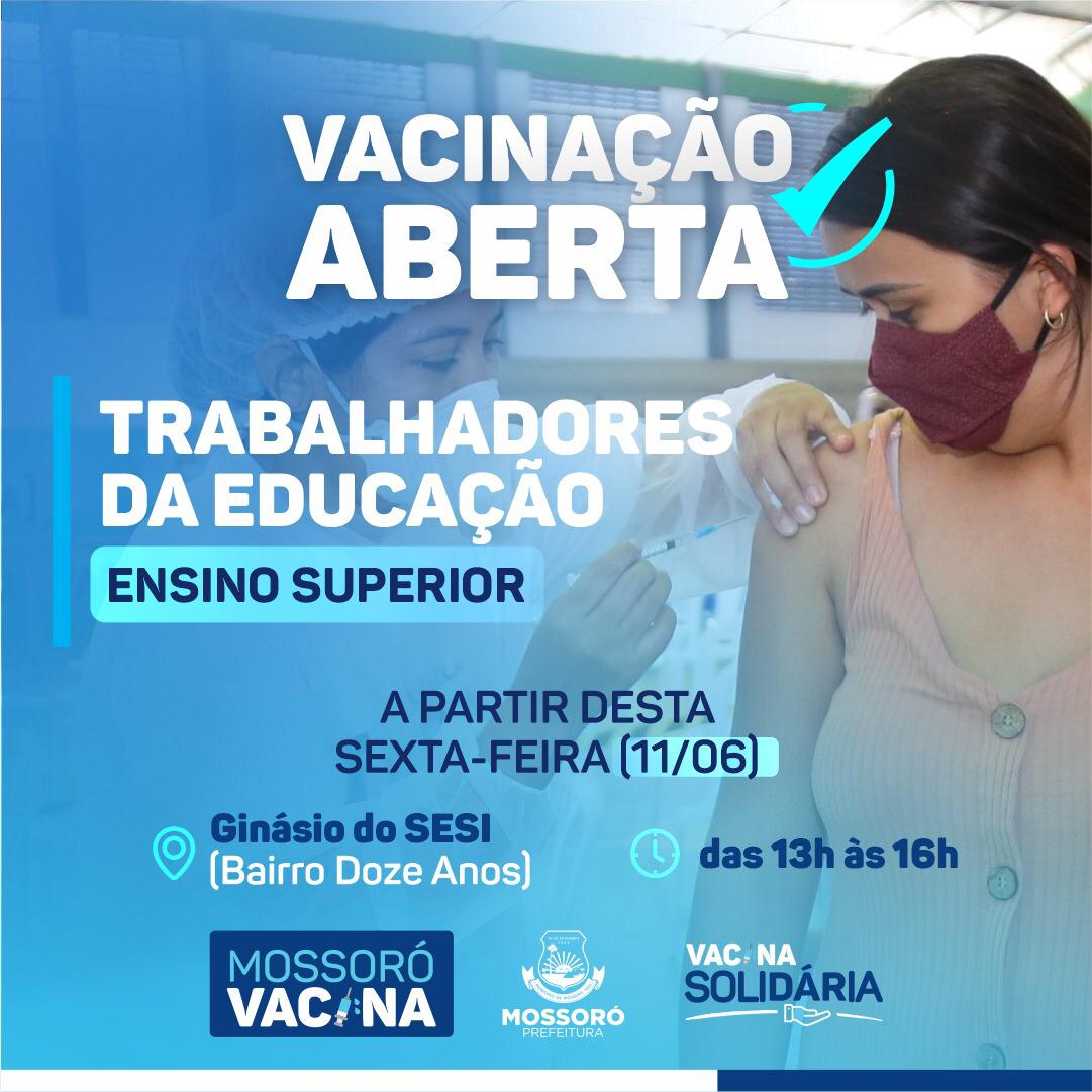 A Prefeitura de Mossoró anunciou a ampliação de mais uma faixa de vacinação contra a covid-19 para profissionais de educação. Desta vez os beneficiados são os da educação superior.