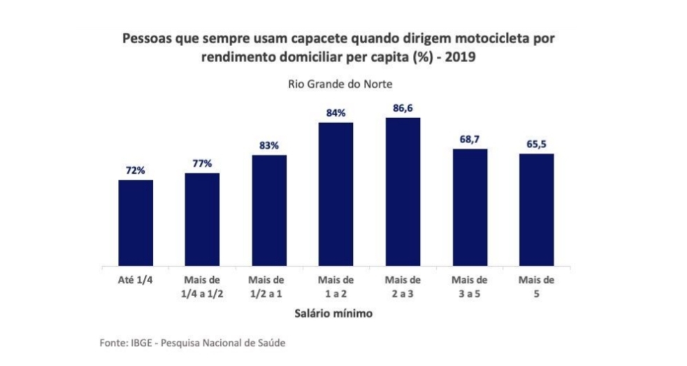 A pesquisa também constatou que há uma diferença quanto ao uso de capacete em diferentes faixas de rendimento. Dos potiguares com renda de 2 a 3 salários mínimos, 86,6% sempre usam capacete quando dirigem uma moto. Por outro lado, apenas 54,2% dos que possuem renda entre ¼ e meio salário mínimo usam capacete quando pilotam uma moto. Passageiros Na capital do Rio Grande do Norte, em média 90% dos adultos de 18 a 59 anos usam capacete quando estão como passageiros em motos. Entretanto, somente 62% das pessoas de 60 anos ou mais usam o equipamento. Somados todos os grupos de idade, 87,9% dos natalenses com 18 anos ou mais usam capacete na garupa da moto.