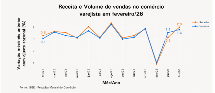 Já na comparação com fevereiro de 2025, as vendas recuaram 1,5% em fevereiro deste ano. Com o resultado, o setor acumula aumento de 0,5% no primeiro bimestre de 2026, em relação ao mesmo período do ano passado. Já em 12 meses, o crescimento acumulado foi de 2,1%.