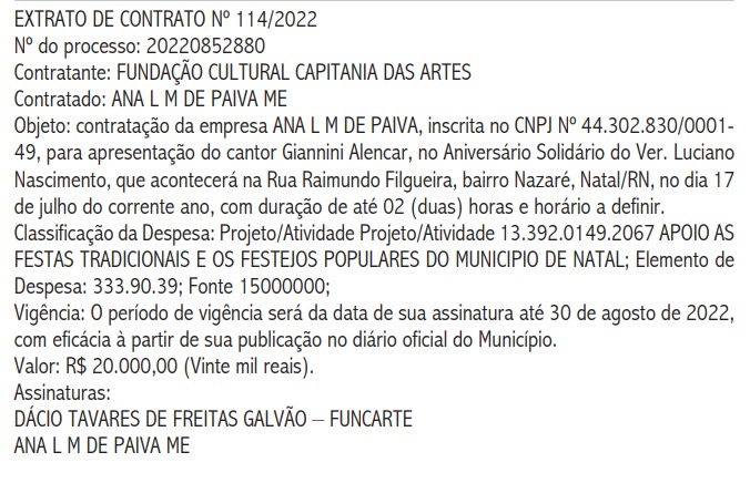 A apresentação consta no contrato como parte do “Aniversário Solidário do Ver. Luciano Nascimento” na rubrica de “APOIO AS FESTAS TRADICIONAIS E OS FESTEJOS POPULARES DO MUNICIPIO DE NATAL”.