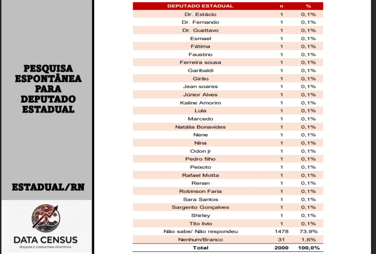 A pesquisa Data Census ouviu 2 mil eleitores de 71 cidades do Rio Grande do Norte entre os dias 18 e 20 de abril. A margem de erro é de 2,1 pontos percentuais para mais ou para menos. A pesquisa foi registrada na Justiça Eleitoral sob o protocolo RN-05562/2026.