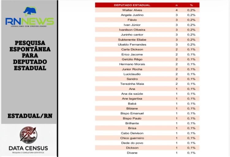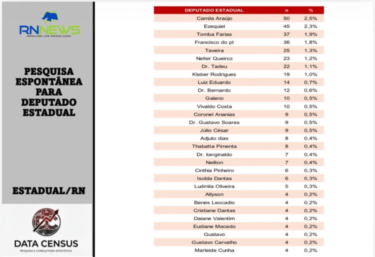A vereadora bolsonarista Camila Araújo (PL) e o presidente da Assembleia Legislativa Ezequiel Ferreira (PSDB) foram os mais citados para deputado estadual na pesquisa de deputado federal do Instituto Data Census divulgada pelo portal RN News.
