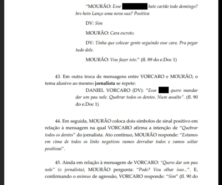 Em uma das conversas, o banqueiro afirma: “Quero mandar dar um pau nele. Quebrar todos os dentes. Num assalto.” Segundo a decisão, Mourão reage com sinais positivos à mensagem e responde: “Estamos em cima de todos os links negativos, vamos derrubar todos e vamos soltar positivas.”