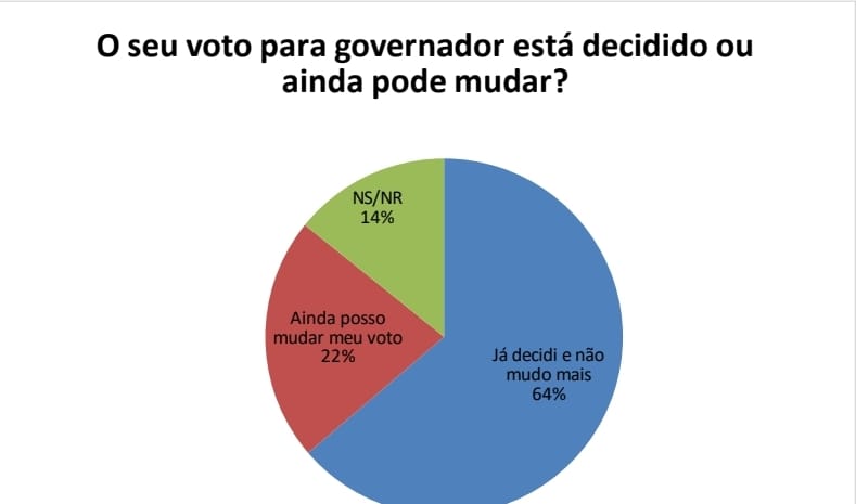 Os eleitores com candidatos ao Governo do Estado estão numa situação intermediária. Entre os que declararam voto em algum candidato 64% disseram que a decisão é definitiva, 22% admitem mudar o voto e 14% não souberam responder.