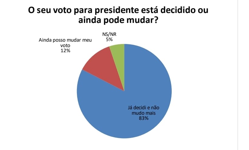 Já os que possuem candidato a presidente o índice de fidelidade do voto é maior com 83% afirmando manter a escolha até o final, somente 12% admitem mudar o voto e 5% não sabe responder.