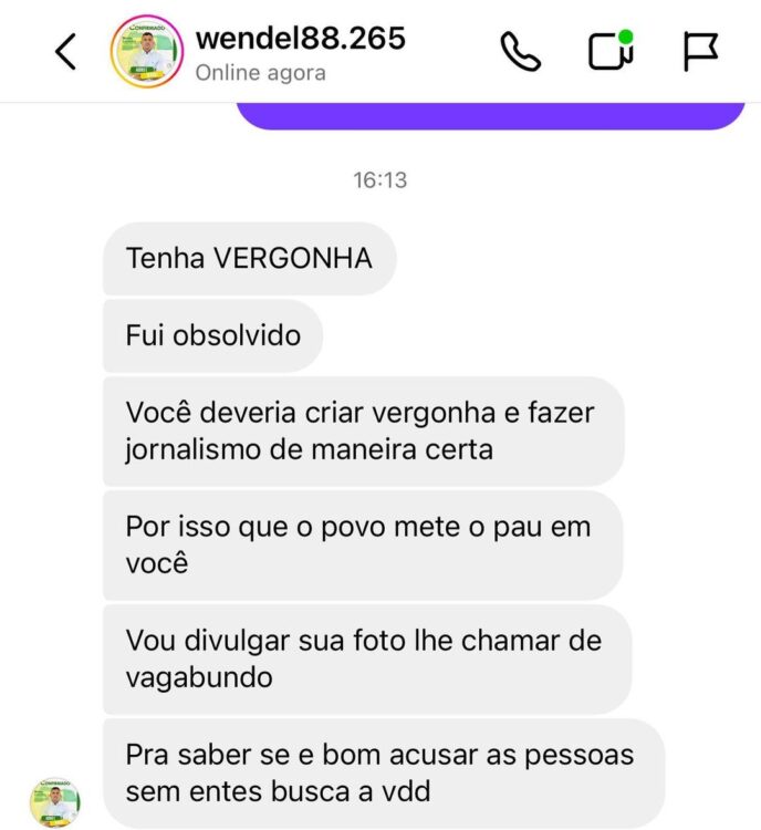 “Tenha vergonha. Fui obsolvido (sic). Você deveria criar vergonha e fazer jornalismo de maneira certa. Por isso que o povo mete o pau em você. Vou divulgar sua foto lhe chamar de vagabundo pra saber se é bom acusar as pessoas sem entes busca a vdd (sic)”.